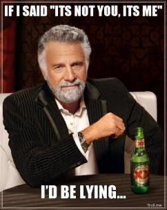 It took about a week and few conversations with the boys and my Chick Bullpen to realize that if she didn’t do the “It’s not you, it’s me” to me, I would’ve did it to her. It just wasn’t meant to be and honestly, we both didn’t know why. It just didn’t fit. For her. Or for me. And it really wasn’t the chicken shit way of ending things. It’s not always a lie. Sometimes it really is you. And not them. Sometimes it’s both of you. Why stay in something if you’re not feeling it? You can still like someone. Find them attractive. Have fun with them. But just feel like you don’t fit with them. Sometimes there isn’t an exact reason. And if you said “I can’t explain it. Everything is going ok. I like you. But I don’t want to be with you and I can’t say why exactly because I honestly don’t know why.” instead of “It’s not you, it’s me” it would drag things out. You would want more because you would think there should be a reason. It would bring out feelings of doubt, anger, suspicion, self loathing, hate. It wouldn’t just end. The band aid would slowly pull on the tiny hairs for a long time with that. Calls. Texts. All that shit because you would want answers. You would want closure. On your terms. Not theirs. And that sucks even more than “It’s not you, it’s me.” I know that now. Because honestly people, sometimes it really is just “It’s not you, it’s me.” Leave it that. Move on. And get back in the game and hope to find someone who gets it the way you get it.